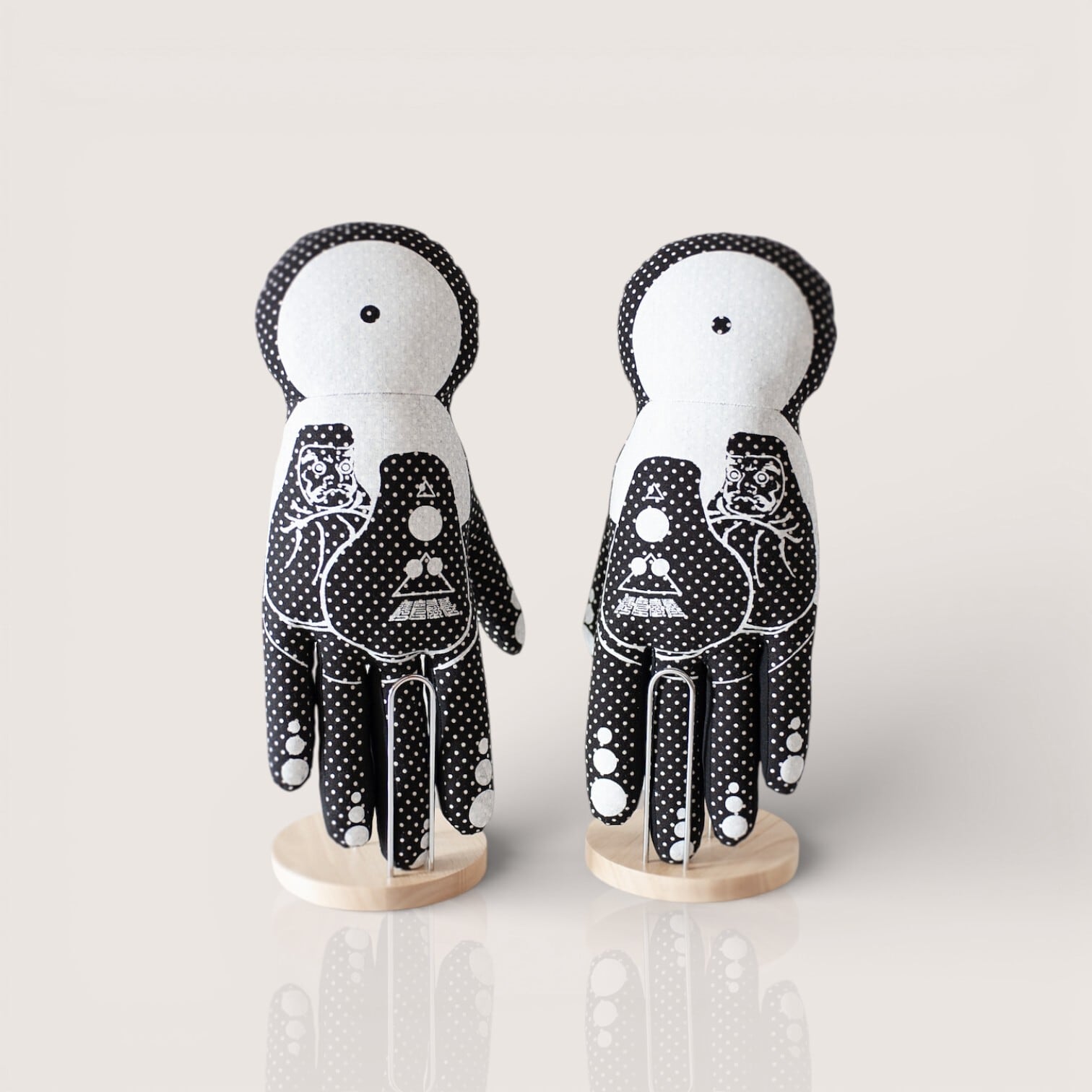 イラストデザイン・シルクスクリーン印刷・縫製のすべてをダルマ武藏本人が一点一点、手作業で制作しています。